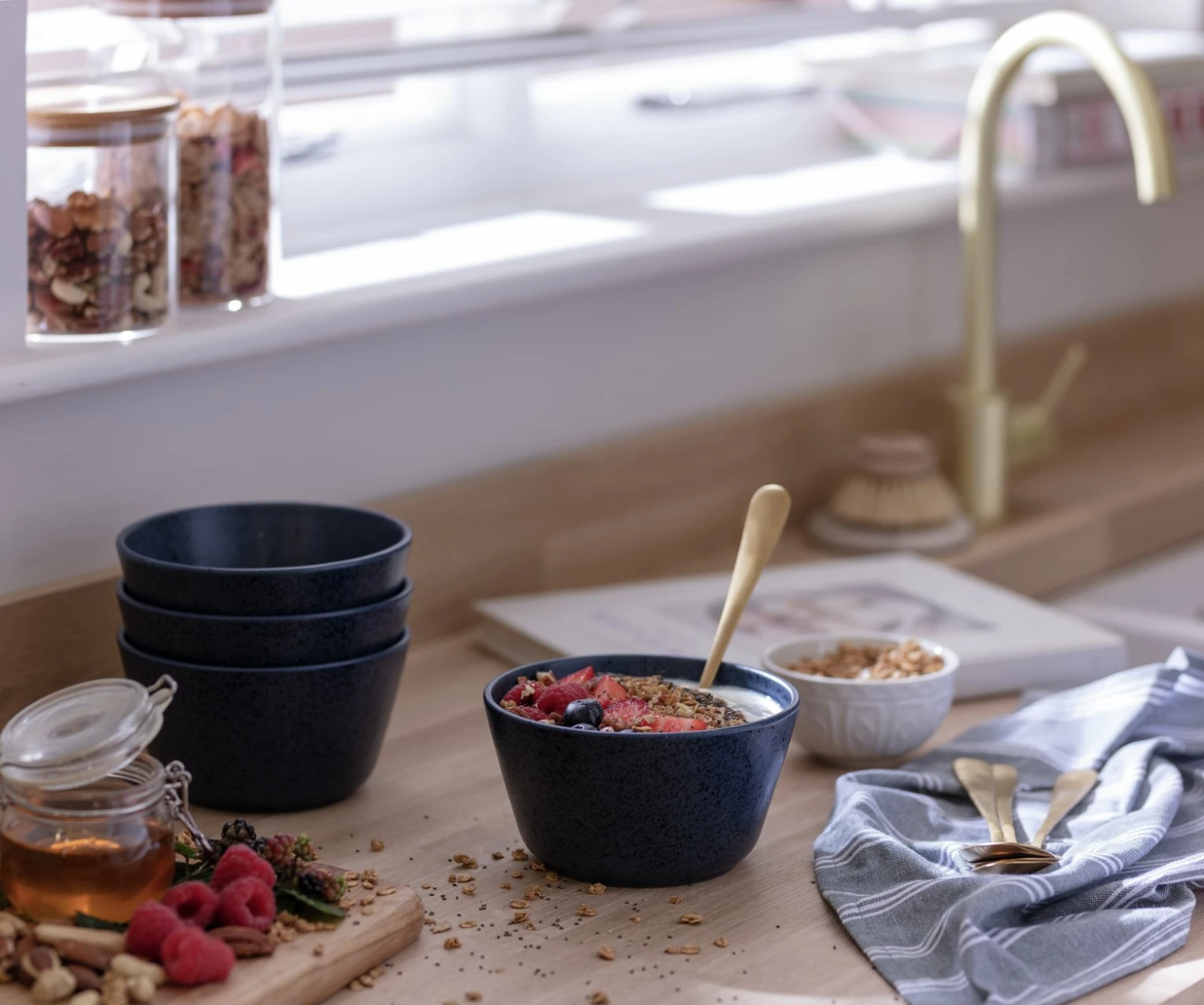 Spruce up that spread. Our set of 4 deep blue cereal bowls bring a big helping of organic style to the table. Simple and contemporary, this speckled stoneware set is great for showing off colourful curries, seasonal soups and morning muesli. A matte glaze gives each one a clean, modern finish. Go on, grab a spoon.