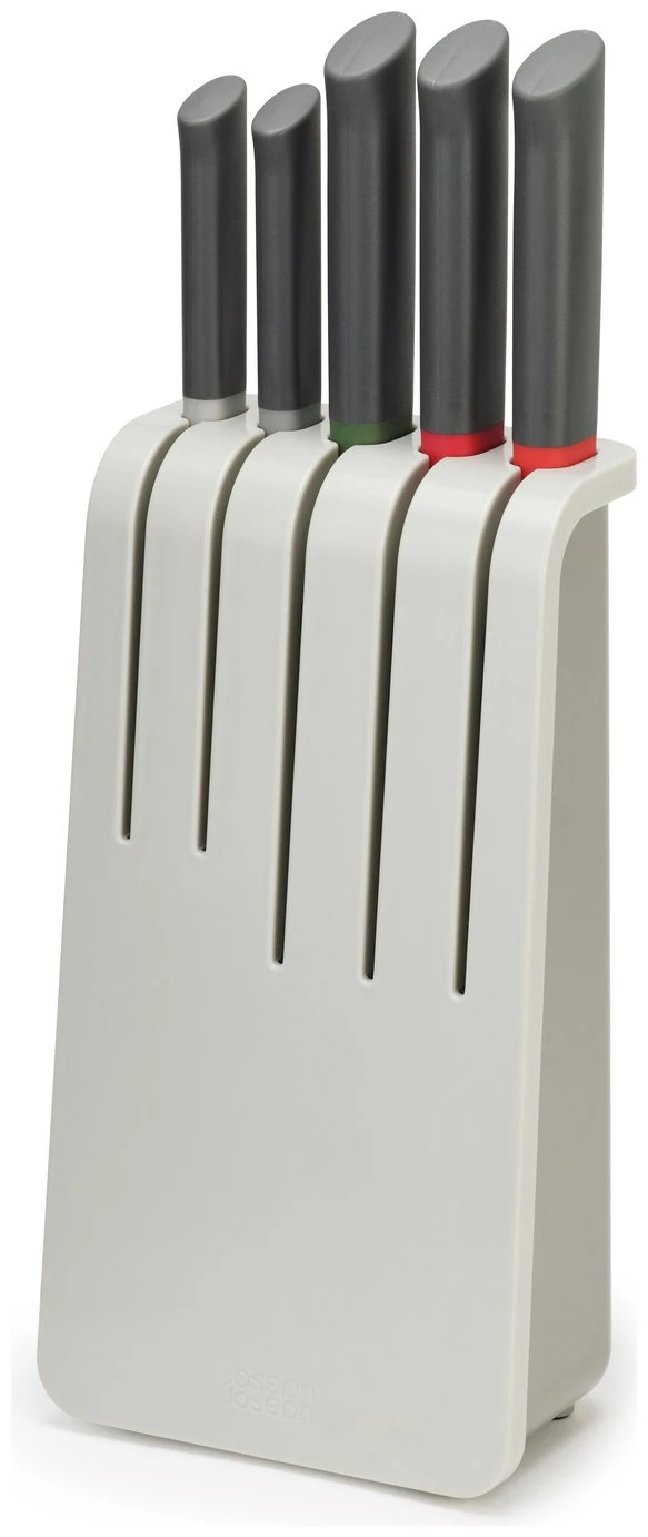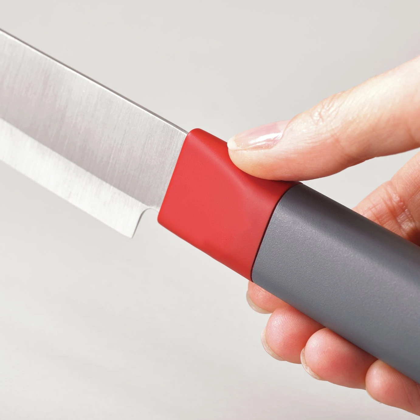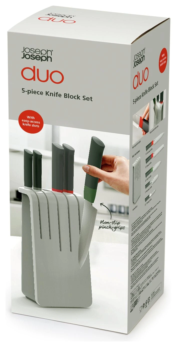 Presented in a sleek grey knife block, this Joseph Joseph Duo set is a kitchen must-have. The knives feature stainless-steel blades and non-slip pinch-grips. They effortlessly slide into the easy-access knife slots of the block. The set includes: 3.5" paring knife, 5" Santoku knife, 6" chef's knife, 8" carving knife and 8" bread knife, covering all your chopping, slicing and carving needs.