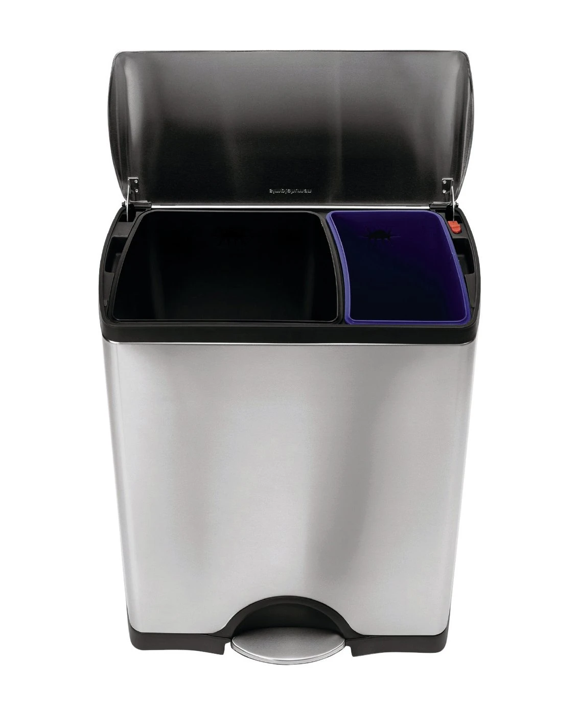 The simplehuman dual compartment rectangular pedal bin has two inner buckets and a space-efficient shape that makes it easy to separate rubbish and recyclables in one place. Our strong steel pedal is engineered to last over 150,000 steps – that's more than 20 steps a day for 20 years, and our patented lid technology ensures a smooth, silent close every time. Fingerprint-proof finish resists smudges to keep stainless steel shiny. simplehuman code H and code V liners are designed to fit this bin perfectly.